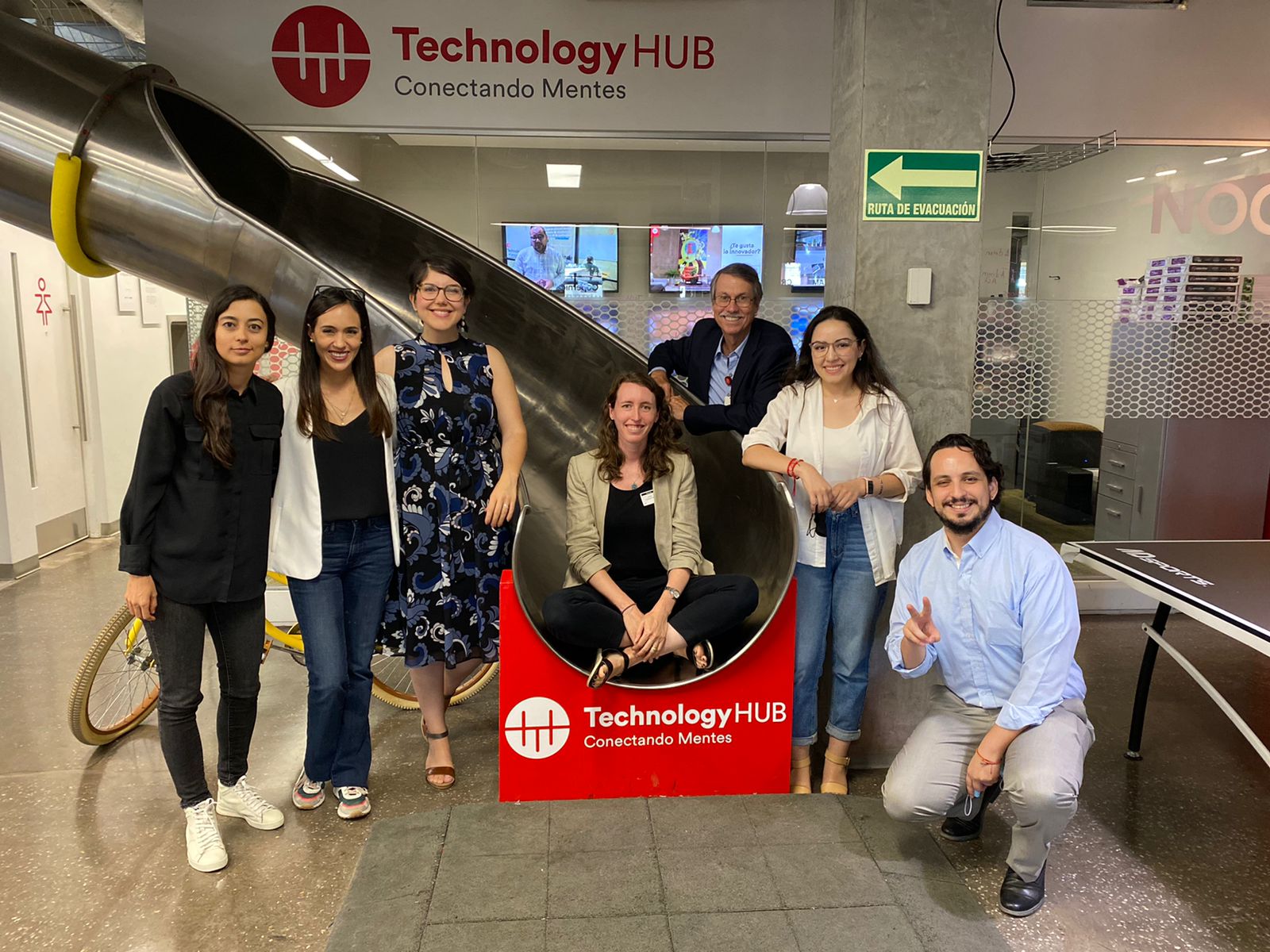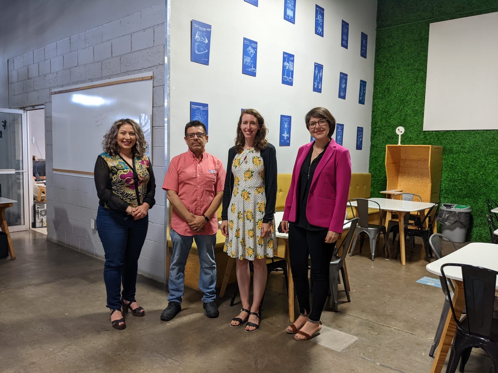 Diana Páez with government and business representatives after the press conference announcing the project in Ciudad Juárez, in August 2022. (From left to right, sitting, Raúl Varela, Director of Institute for Innovation and Competitiveness, María Angélica Granados Trespalacios, Secretary of Innovation and Economic Development of Chihuahua (SIDE), Fernando Alba, Under Secretary for Mining, Energy and Industry, and Ulises Fernández, Under Secretary for Innovation and Economic Development. From left to right, standing, Sergio Mancinas, Director of INADET, Jaime Campos, Industry Director at SIDE, René Chavira, Executive Director, Desarrollo Económico del Estado de Chihuahua, and Guillermo Alvarez, Executive Director, Chihuahua Futura.