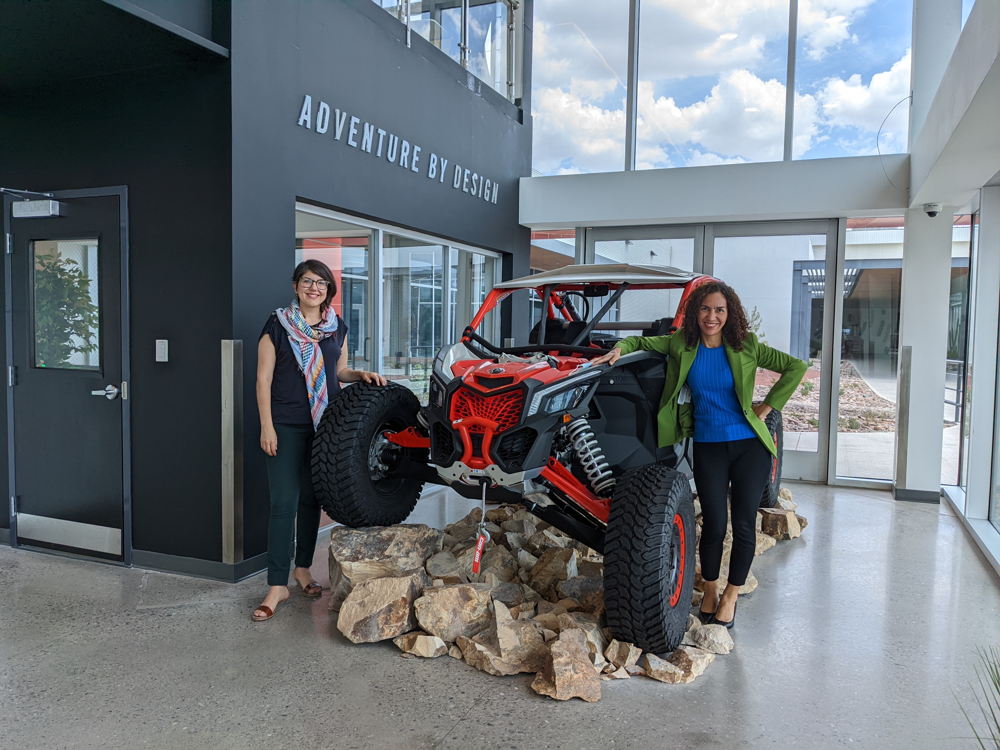 In Chihuahua city, Dana Gorodetsky, Diana Páez and Karen Thomas, Manager of the Chihuahua Automotive Cluster, visit BM Castings, an aluminum die casting company to meet with Sergio Mendoza, Founder and Partner (left), and Aureliano Lugo, Ford Chihuahua Engine Plant Manager (center).The WDI team and Karen Thomas meet with Raúl Pasillas, Manufacturing Engineering Plant Manager at ZF Group in Chihuahua city, which manufactures steering wheels and safety-related products for Tesla, Lucid, Ford and other companies.One of the buildings at the Centro de Innovación e Integración de Tecnologías Avanzadas (CIITA) in Ciudad Juárez. The CIITA is managed by the Polytechnic National Institute of Mexico. In Ciudad Juárez, the WDI team visit Lear Corporation, an important supplier of automotive seating and e-systems for automakers such as Ford, GM and other companies.At the Technology Hub in Ciudad Juárez, a major business innovation center offering office space, technology training and event venues for the business community, and a variety of programs to support local entrepreneurs in the region.Also at the Technology Hub, the WDI team and Mariana Ramírez from SIDE meet with Enrique Alvelais (third from right), Director of Desarrollo Económico de Ciudad Juárez (DECJ) and his team. DECJ is a non-profit, business-led economic development organization working to improve quality of life in the city. Diana Páez with Ivette Camacho, Manager of Public Affairs and Government Relations at the BRP manufacturing facility in Ciudad Juárez with one of the firm’s products. BRP specializes in the design, manufacturing, distribution, and marketing of motorized recreational vehicles and powersports engines.